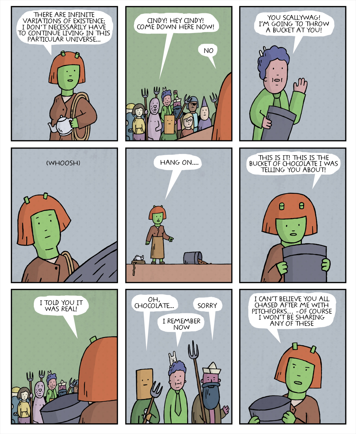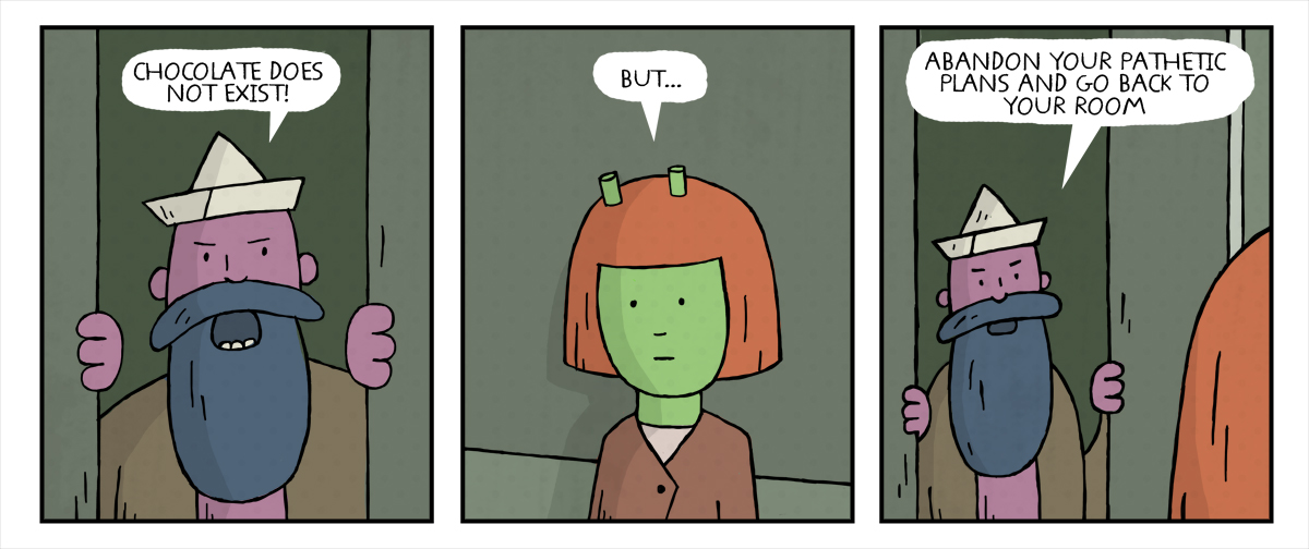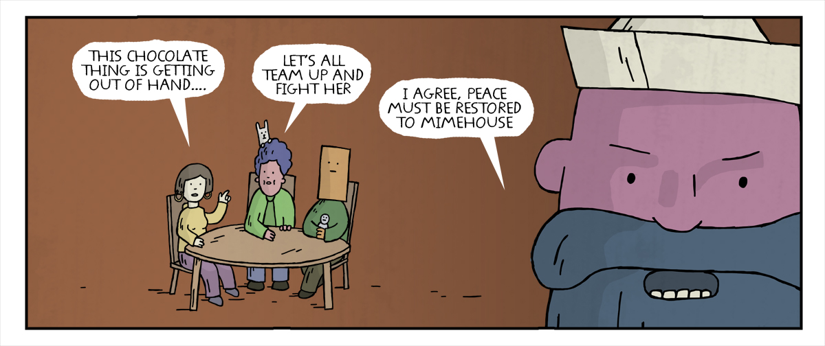 Well, what I could I do? I began to doubt myself. Perhaps chocolate wasn’t real. Maybe I had imagined it all. Confronted by the accumulating evidence, I struggled to accept that I lived in a world where chocolate didn’t exist. I really struggled! Lost, frightened and confused, I began to wander hopelessly throughout the desolate and decaying hallways of Mimehouse. As each foot fell sluggishly in front of the other, I felt the walls around me trembling with anguish. All the positive affirmations in the world couldn’t help me now…