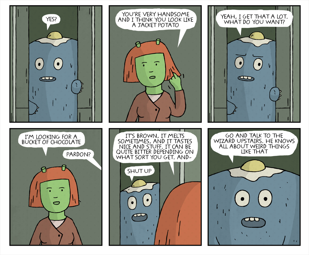 I kept moving from door to door as I was continuously met with the same unhelpful responses. Though I found the humans charming, they were also quite dirty, and this was totally unforgivable. Also, one of them tried to bite me. The corridor itself had an odd green carpet and it was full of damp wooden fixtures. I watched as gangs of naked people rubbed sauce upon the walls. Suddenly, feeling slightly overdressed, I removed my shoes and kept walking…