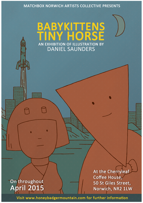 ‘Babykittens Tiny Horse; An exhibition of Illustration by Daniel Saunders’ will be on display throughout April at the Cherryleaf Cafe in Norwich, and it will feature all sorts of fancy artwork. Partly retrospective, it will also feature a very sneaky preview of my latest graphic novel, ‘Babykittens Tiny Horse’. (The one I mentioned in my New Year’s update.)