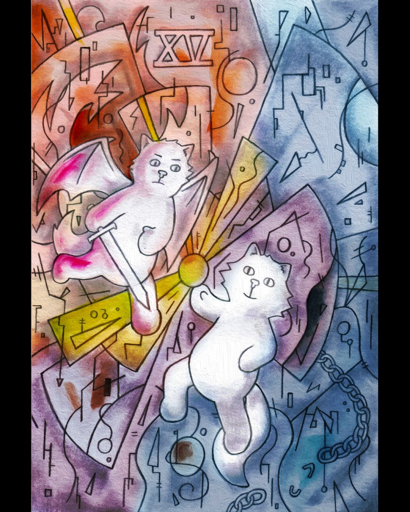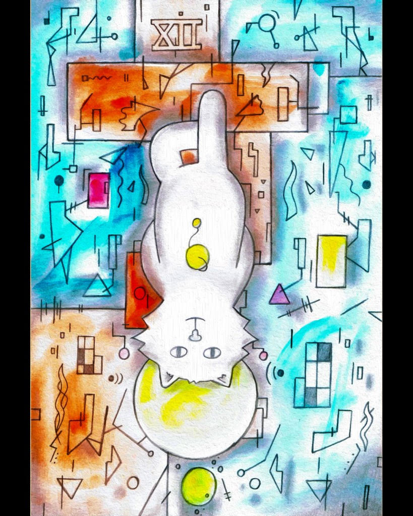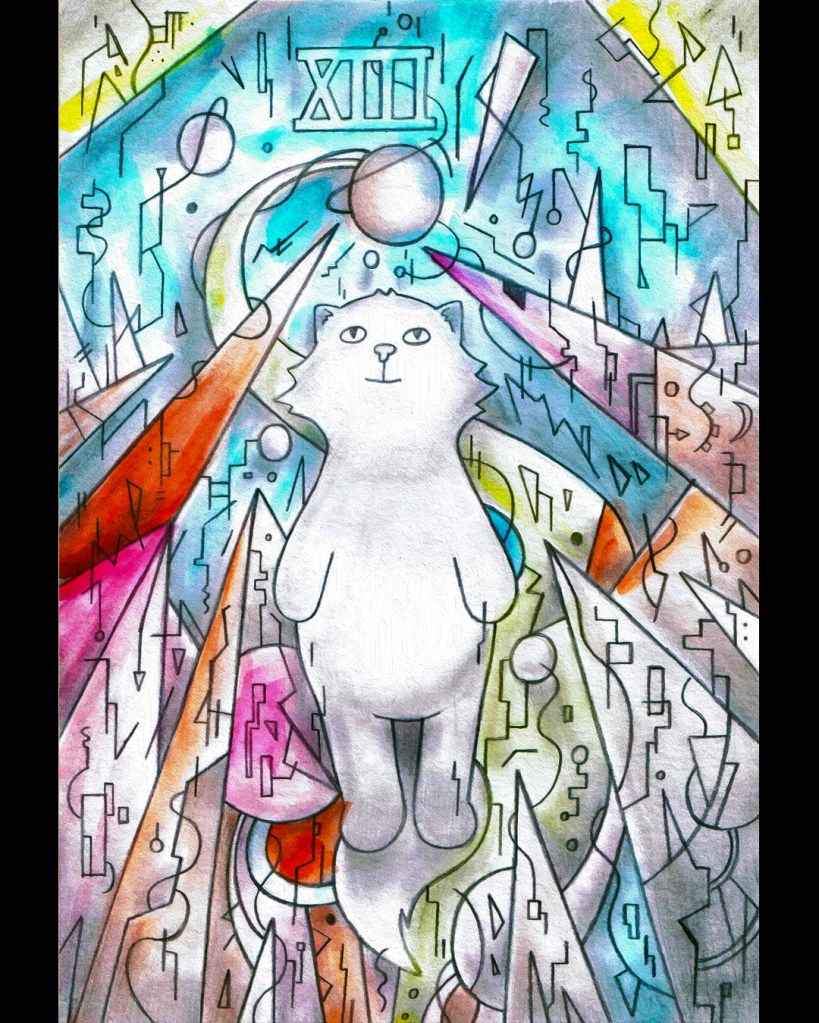 I’m currently working on a series of illustrations based on the Major Arcana. I’ve been using pencil and watercolour to create abstract compositions with channeled lightcode symbols. I’m interested in exploring the “Fool’s journey” throughout the Major Arcana and its various subjects, including life, death, judgement, and the cyclical nature of existence.